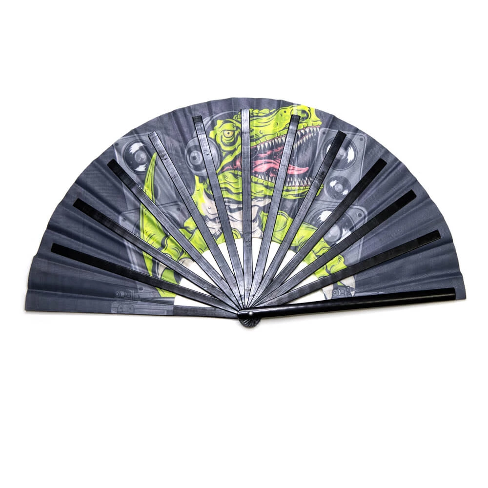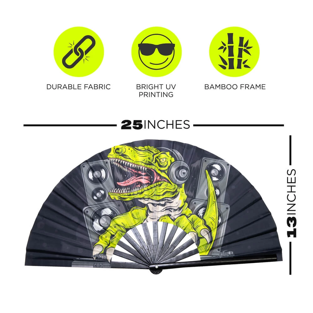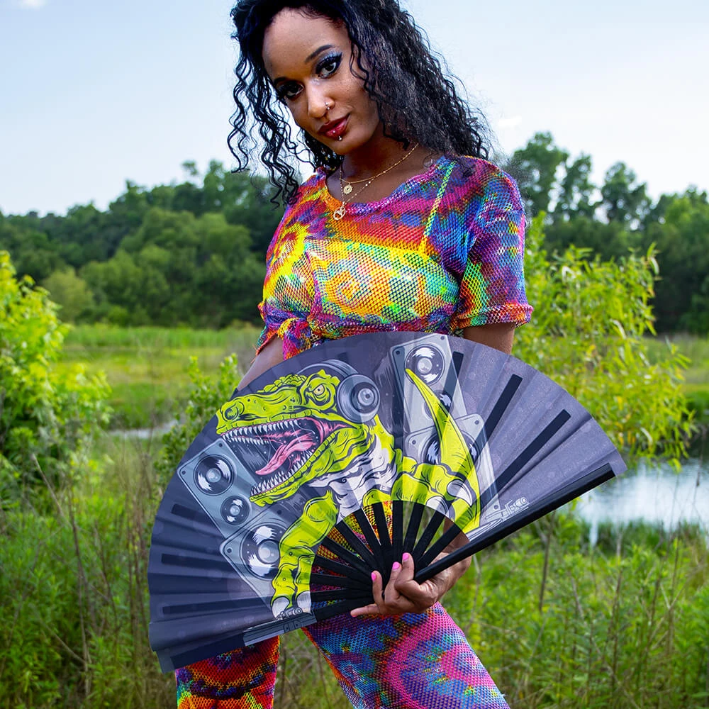 DJ Dino can headline your rave gear at Lost Lands this year. This Dinosaur fan is water-resistant, made of durable cloth, sturdy bamboo, and is just the right size to fit lightly in your bag with ease! Complete your perfect festival outfit with the GloFX folding fan today!