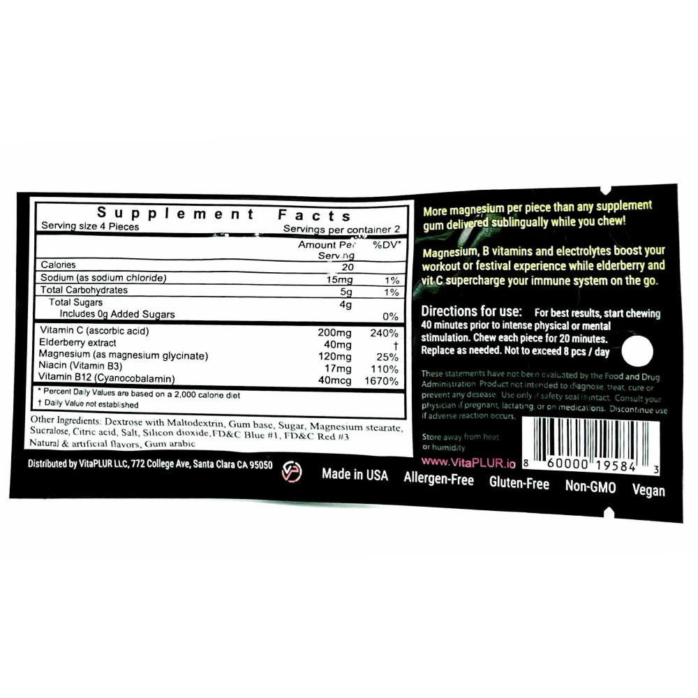 Immune boosting elderberry enhanced with vitamin C plus 20% more magnesium makes this gum perfect at the gym or a festival.
